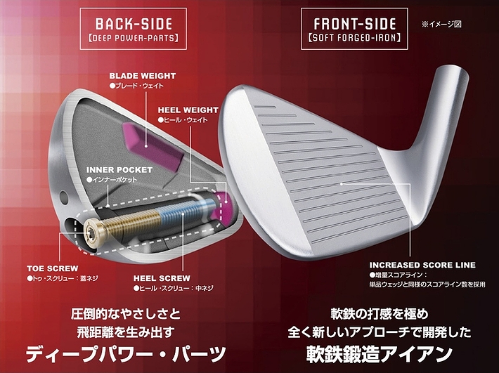 ディープパワーパーツと、軟鉄を極めた設計。ウェッジ同様の増量スコアラインでフェースに球が吸い付くコントロール性能。